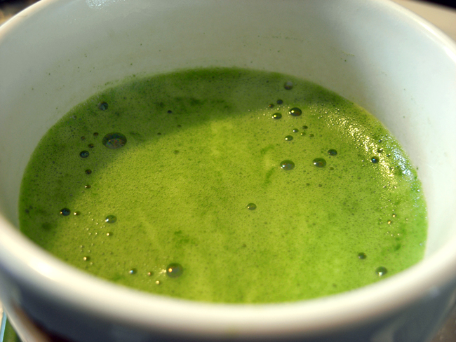 お気に入りカフェのアイス抹茶ラテをまねっこ。混ぜ過ぎて上の白い部分も抹茶色に…